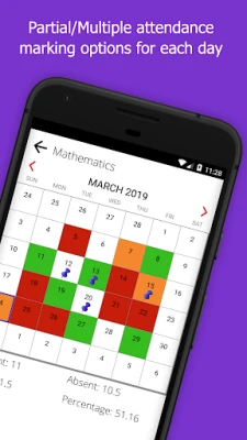 ◆ A swipeable calendar for each subject in which the dates are colour coded according to the attendance