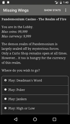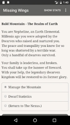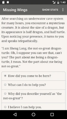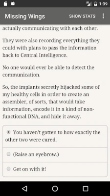 "Missing Wings" is a 140,000 word interactive novel by Carlos H. Romero Jr., where your choices control the story. It's entirely text-based—without graphics or sound effects—and fueled by the vast, unstoppable power of your imagination.