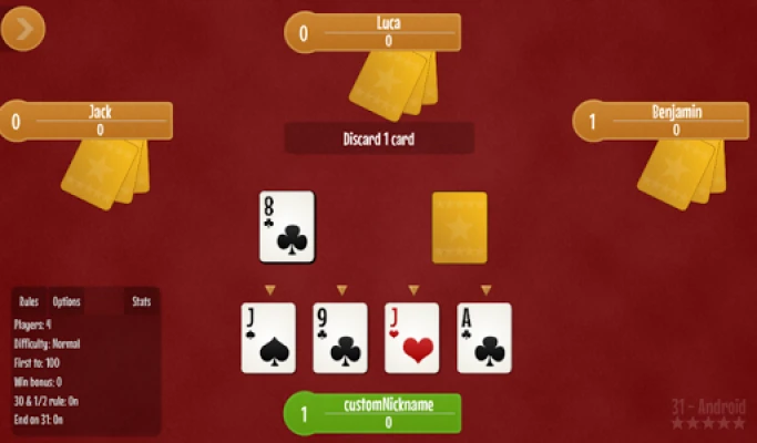 * At the beginning of your turn, you have the option to "knock" (knock button will show up at the beginning of your turn). If you knock and you have exactly thirty one points you win instantly, otherwise you lose your turn and the users will have 1 more turn before the round is over